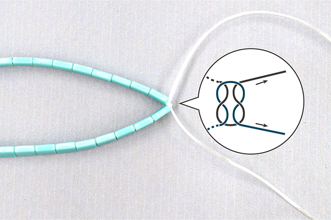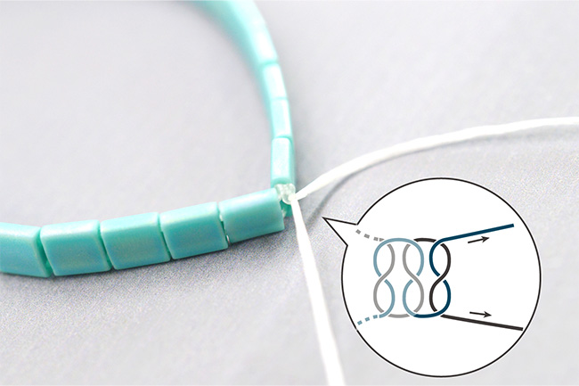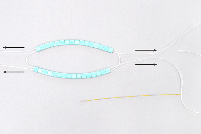 By stringing the beads as shown below, finishing the elastic is much easier because you don’t have four strands of beads right next to each other.