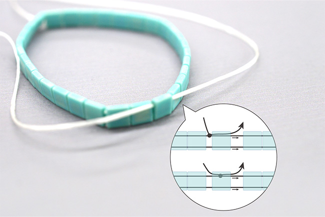Thread the needle onto your spool of elastic and string the tilas until your bracelet is long enough. We use about 17 cm of elastic.