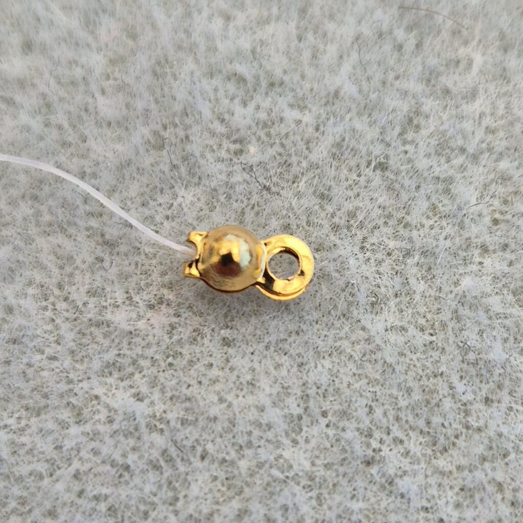 Once your bead is securely attached to the wire, trim the end. Then, thread the cap, ensuring it fits neatly over the crimp bead. Make sure the cap’s ring is positioned at the end of the wire.