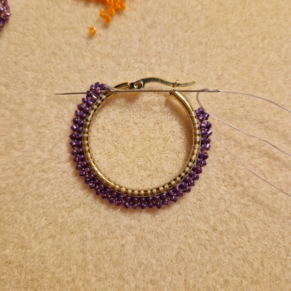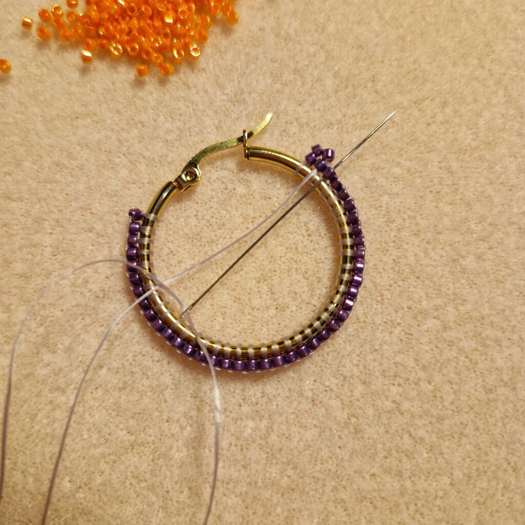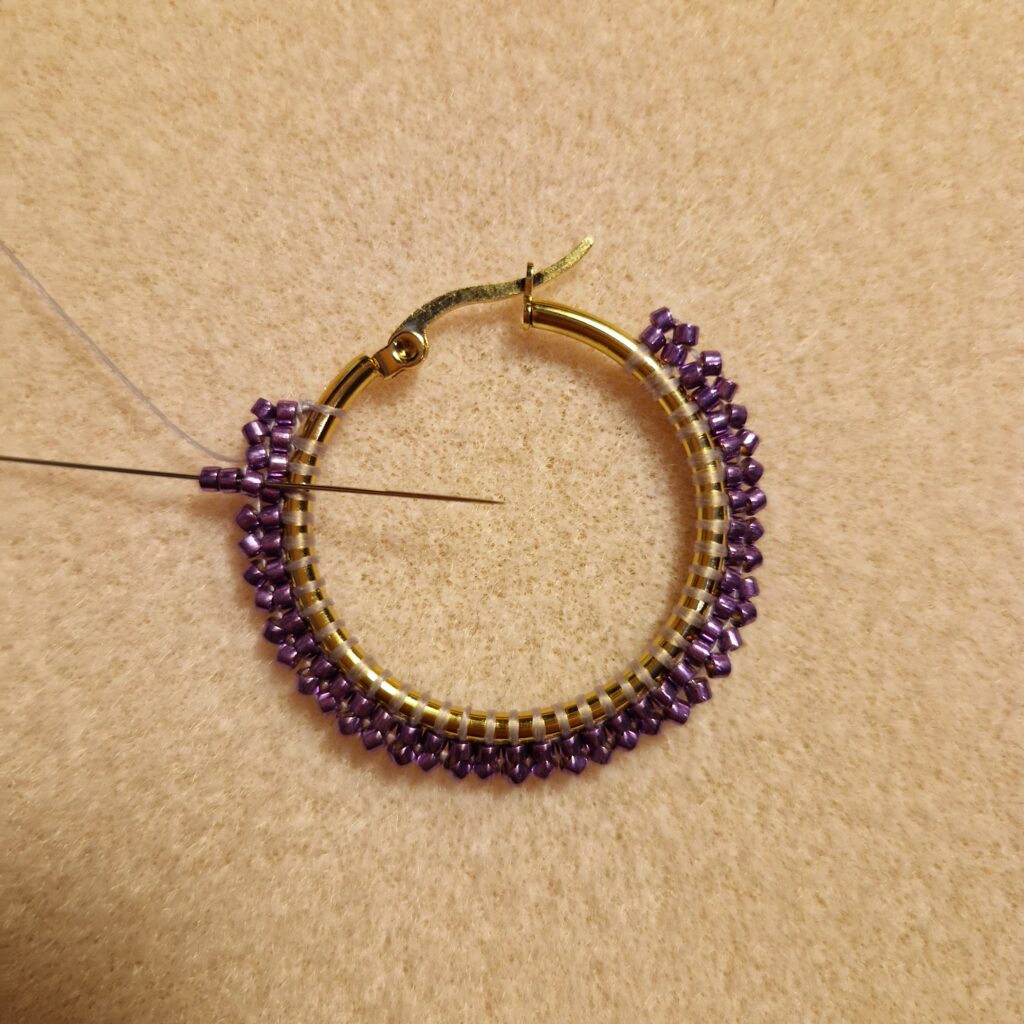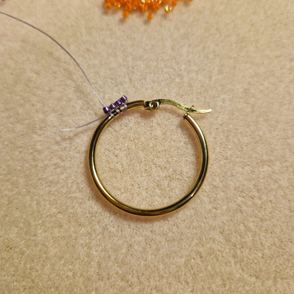 2. Now thread 1 bead and insert the needle through the center of the hoop earring again and then through the delica from the bottom up. Pull the thread carefully but firmly. Now you have a nice row of 3 beads. Continue to repeat this until the hoop is properly filled. Please note to always string an even number on the hoop because you will always string pairs of 2 beads with the herringbone technique.