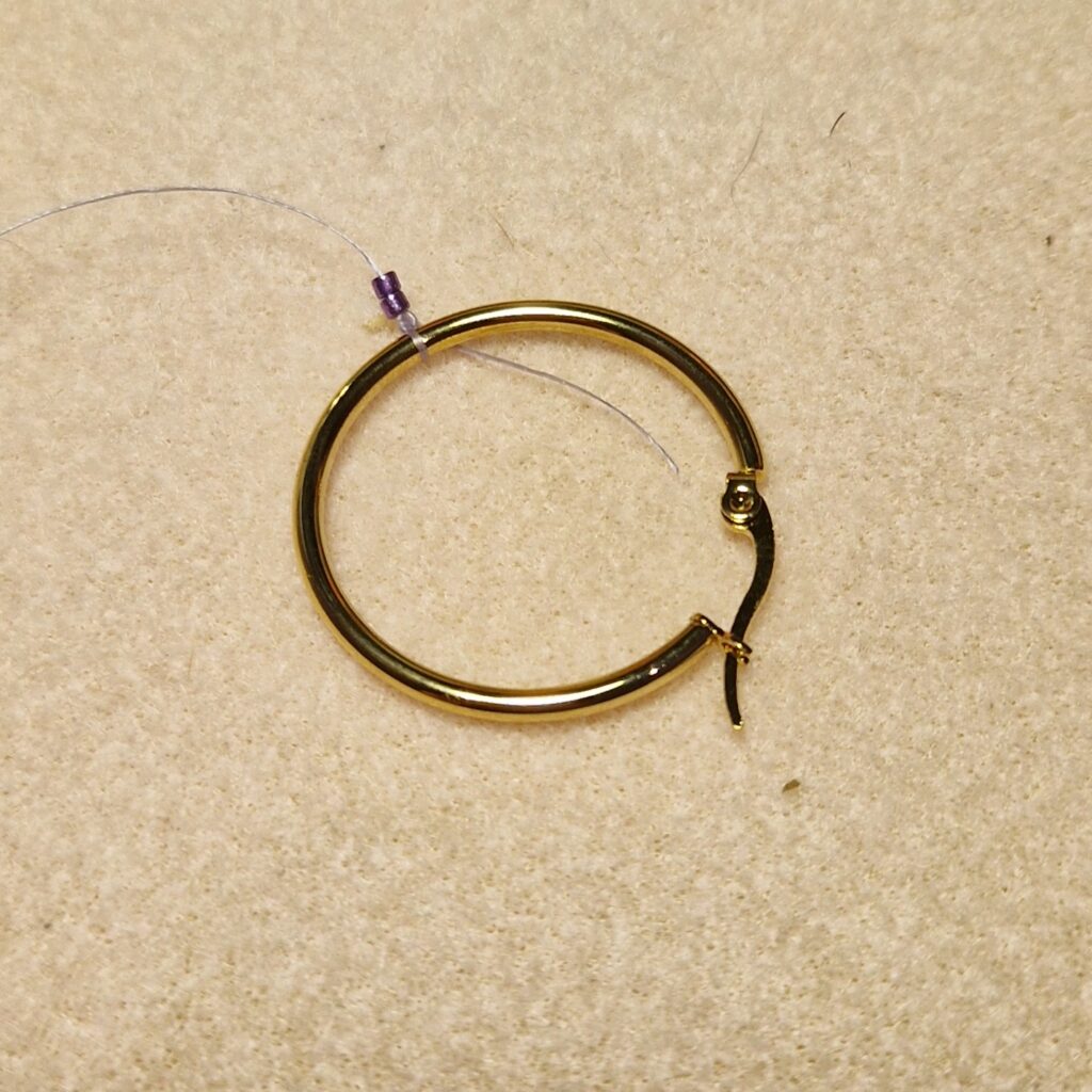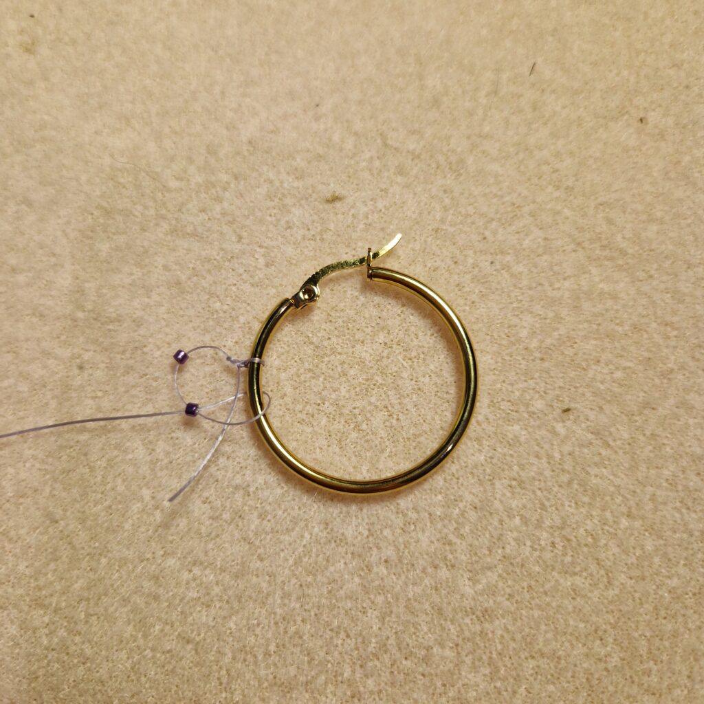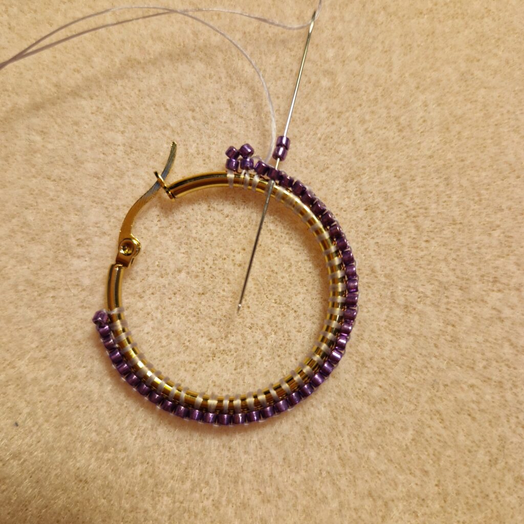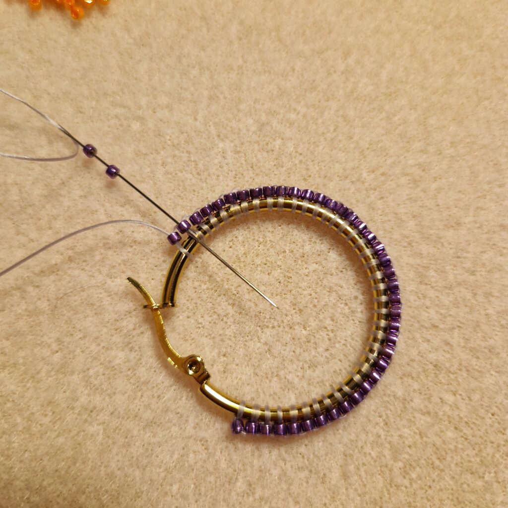 2. Now thread 1 bead and insert the needle through the center of the hoop earring again and then through the delica from the bottom up. Pull the thread carefully but firmly. Now you have a nice row of 3 beads. Continue to repeat this until the hoop is properly filled. Please note to always string an even number on the hoop because you will always string pairs of 2 beads with the herringbone technique.