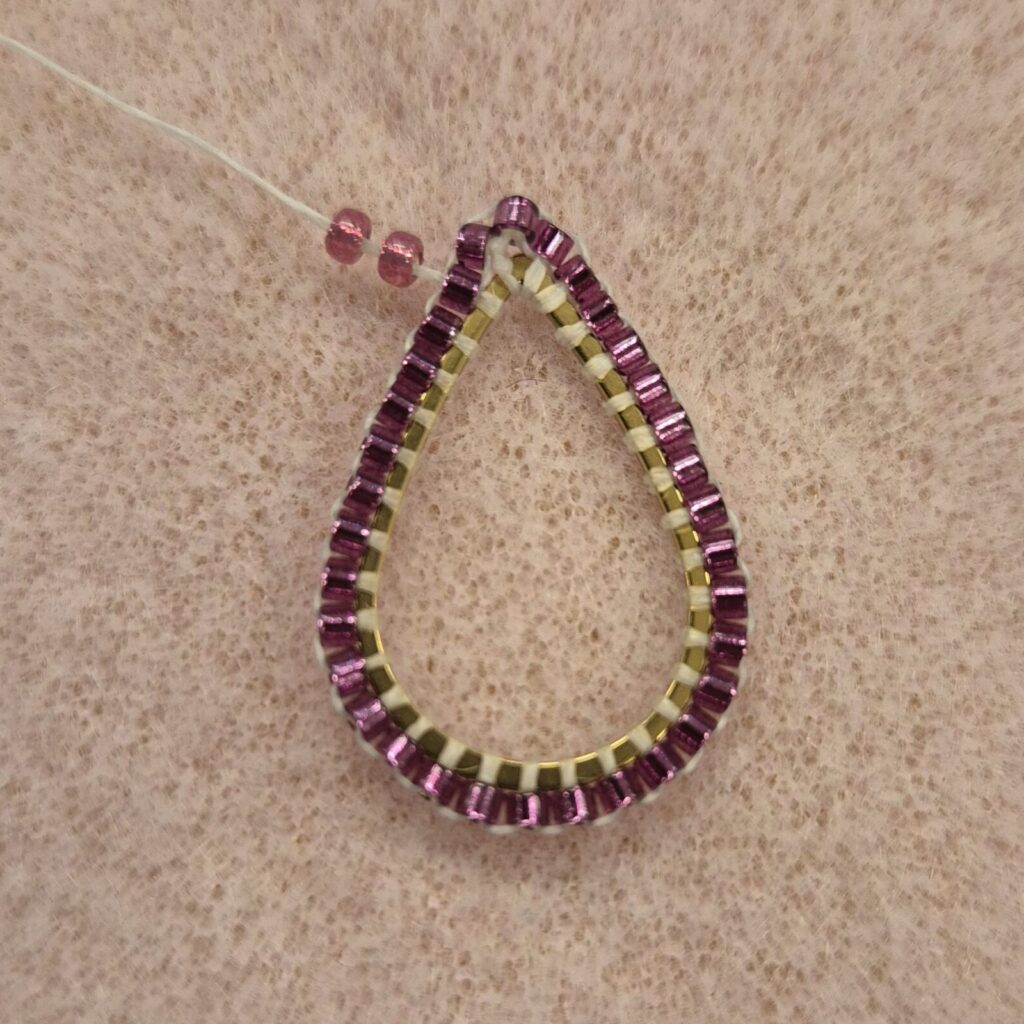 Once you’ve made it all the way around, thread it through your first delica bead as if it were your next brick stitch bead. This way, they’ll fit together nicely, and you’ll have a perfect finish for your next round.