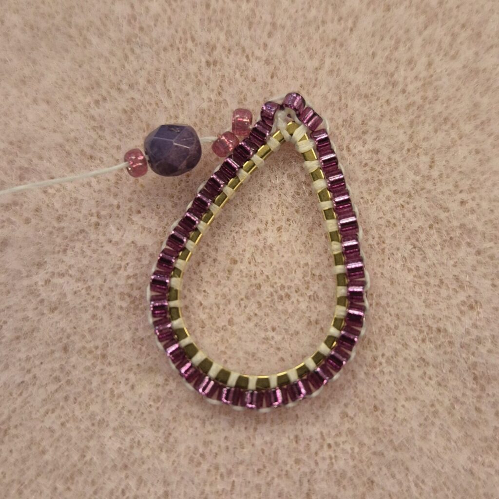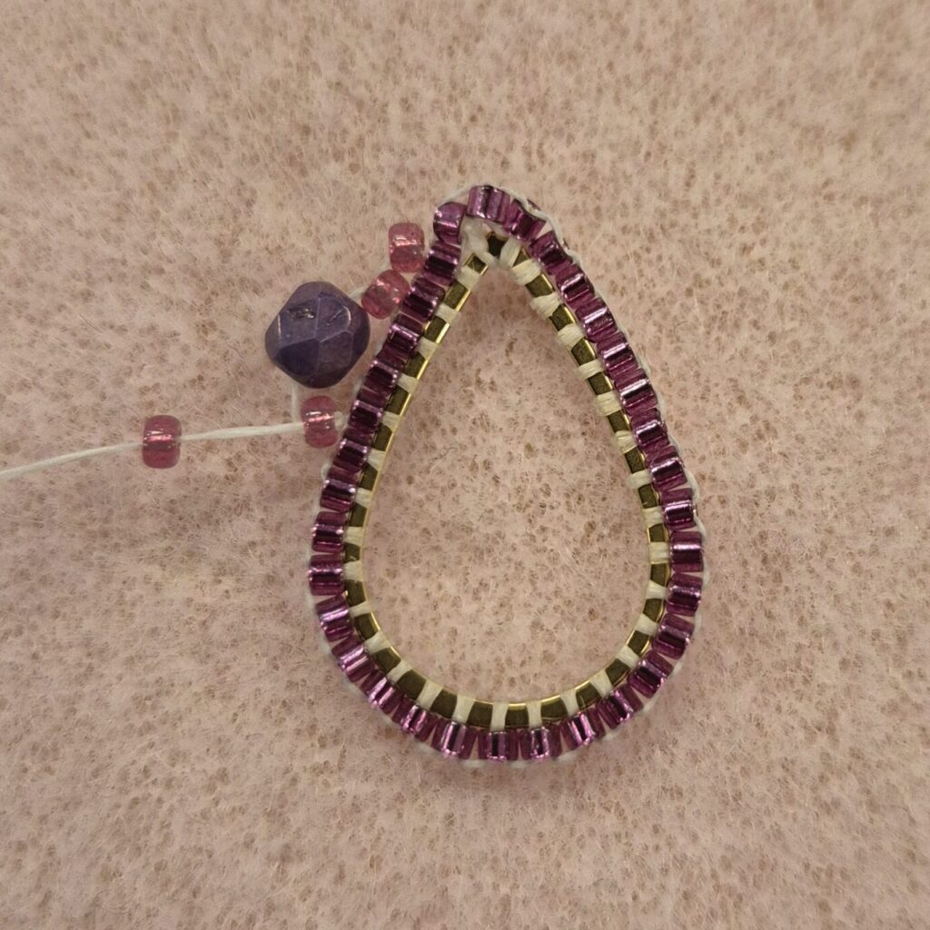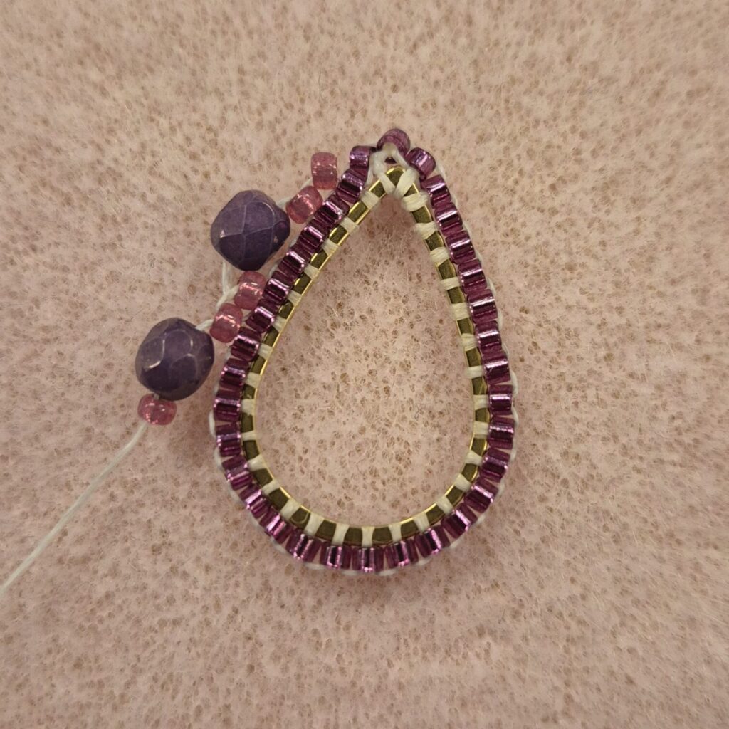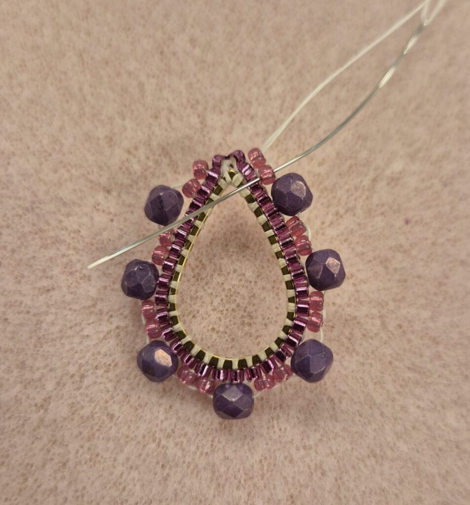 Now thread a bead back. Then, go under the bead again through the loop and thread upwards/outwards again to be ready for the next step. TIP! If the faceted beads don’t line up nicely against each other, you can slide them over the drop ring a bit. (This isn’t easy, but it’s certainly possible.)