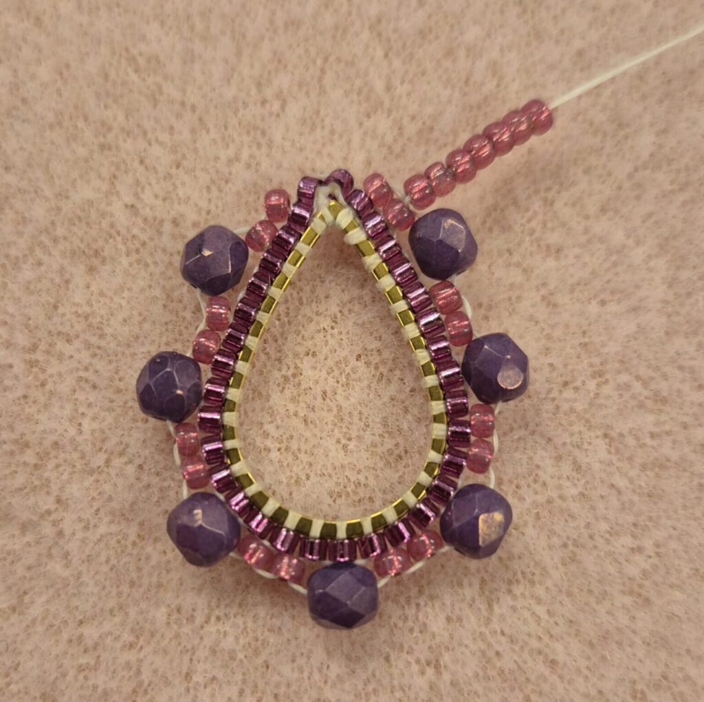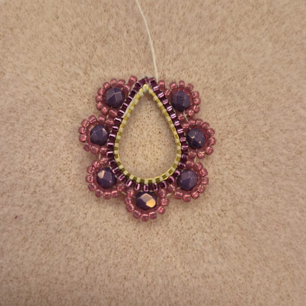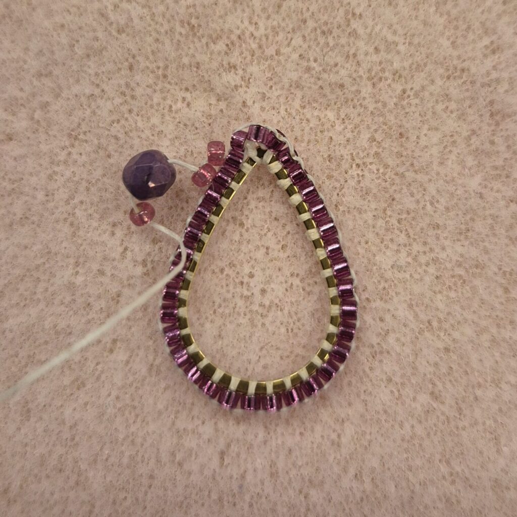 Now thread a bead back. Then, go under the bead again through the loop and thread upwards/outwards again to be ready for the next step. TIP! If the faceted beads don’t line up nicely against each other, you can slide them over the drop ring a bit. (This isn’t easy, but it’s certainly possible.)