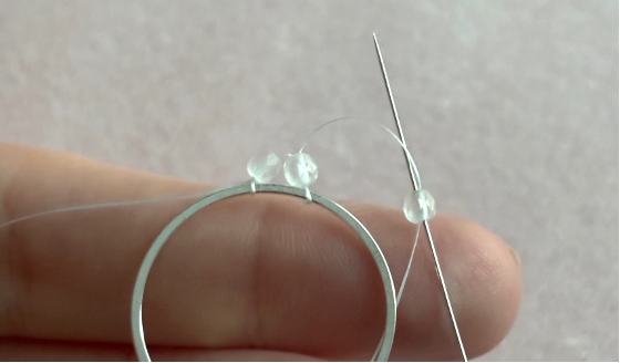 Thread two beads and then pass the needle under the ring. Then thread it back up through the bottom of the bead. This is a clearer example of the brick stitch technique, using larger beads.