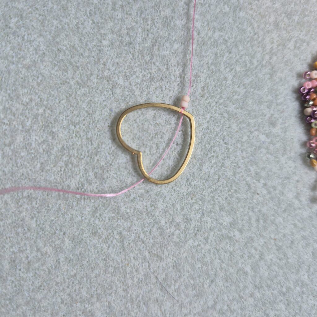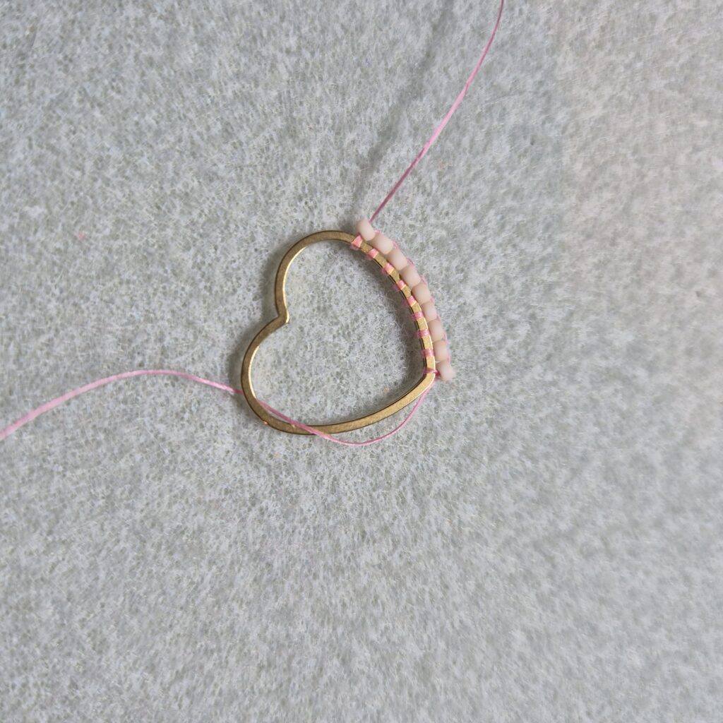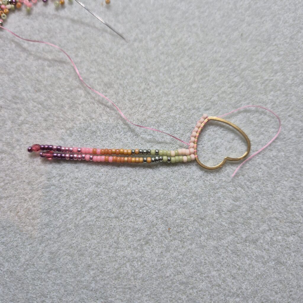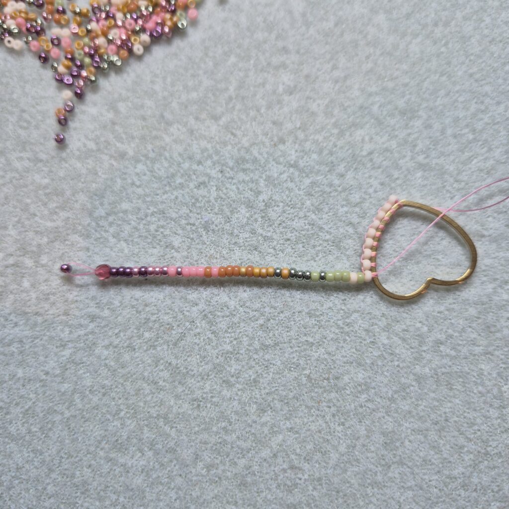 To create a sturdy base for the fringe, begin with a row of nine beads secured using the brick stitch technique. The following photos show how to apply the brick stitch technique to the heart. Begin with a secure double knot to secure the (approximately 150cm) wire and string the beads as follows: