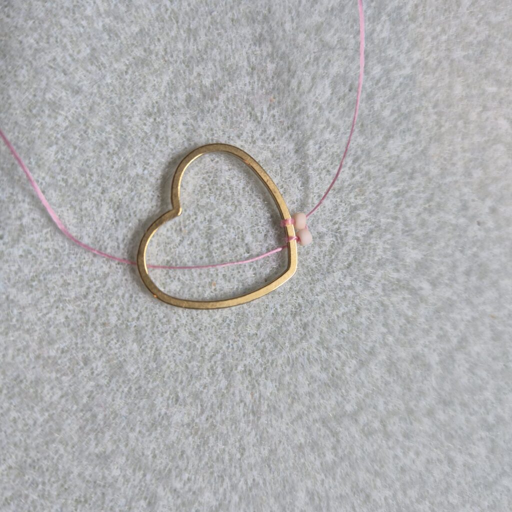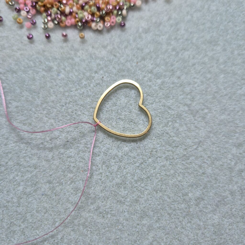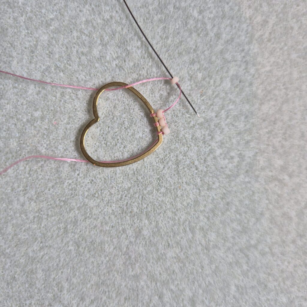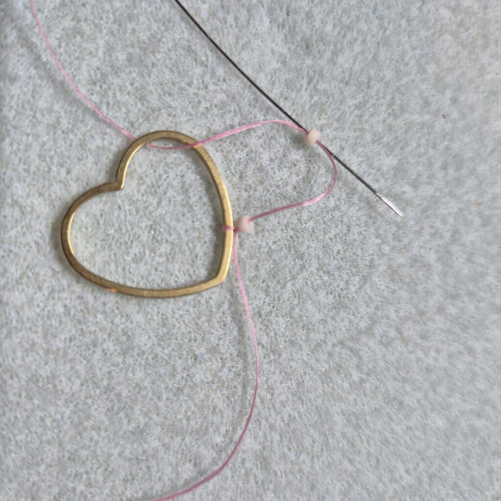 To create a sturdy base for the fringe, begin with a row of nine beads secured using the brick stitch technique. The following photos show how to apply the brick stitch technique to the heart. Begin with a secure double knot to secure the (approximately 150cm) wire and string the beads as follows: