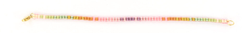 We made this bracelet using the ladder stitch method. You use the same threading thread you used for the earrings. You can choose your own clasp, but we added a lobster clasp and a jump ring. If it fits, you can thread the jump ring through the beads; otherwise, you can hang it on the thread between the two beads.