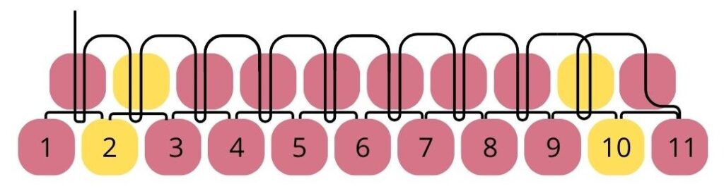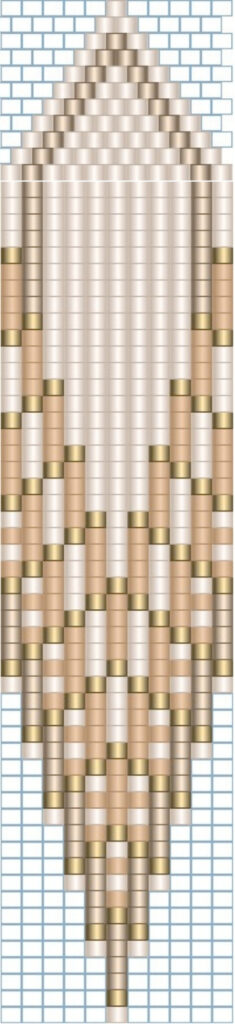 The top is now finished, and we can continue with the fringes. You can thread the thread all the way from top to bottom, or you can start with a new thread, which is also an option. Pay close attention to your pattern and count carefully, as each fringe has a different number to create a beautiful pattern and height variation. String the beads as shown in the next image. You don’t need to tie them together; simply continue threading them through the next bead. Be careful not to pull them too tight, but definitely not too loose either.