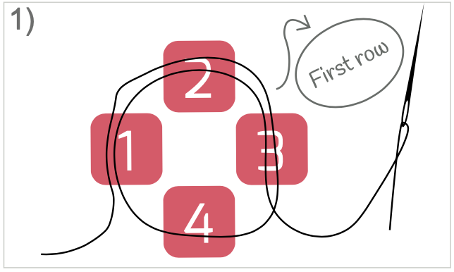 To begin, string four beads. Now, string them again in the same direction through beads 1, 2, and 3. Pull the thread all the way tight. This will create a circle around the beads.