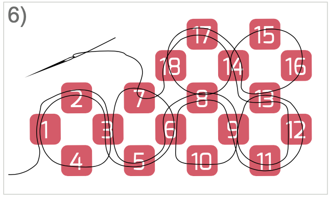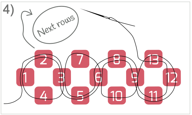 Now add another stitch of beads and finish by stringing from bead 13. You’ll end from the left side of the bead and will continue in this direction (clockwise).