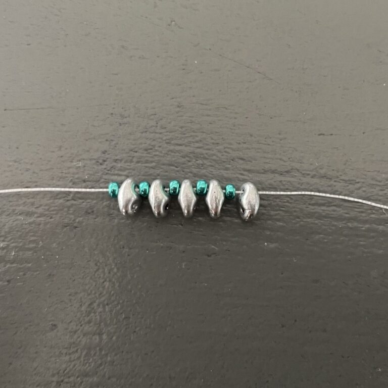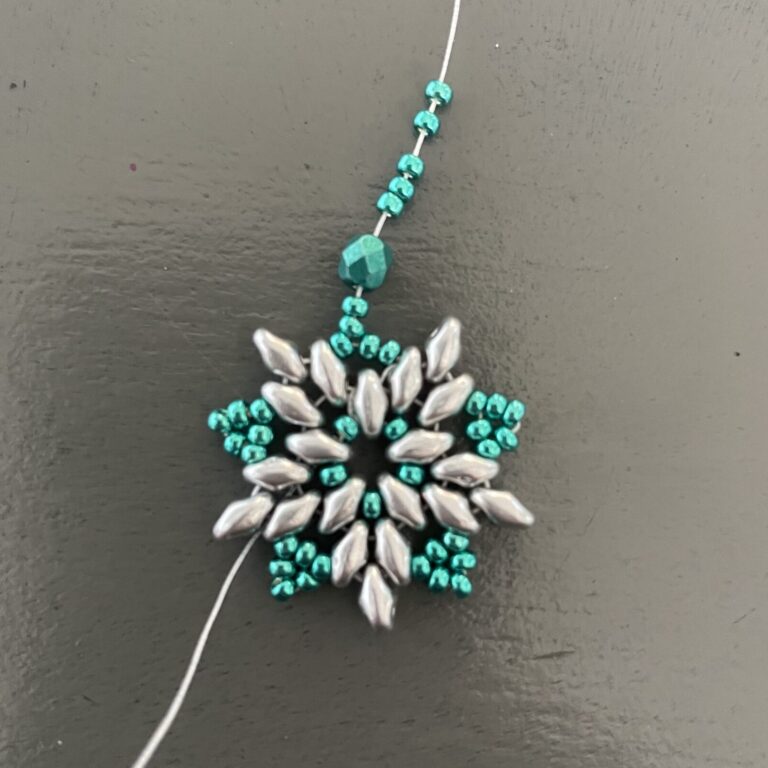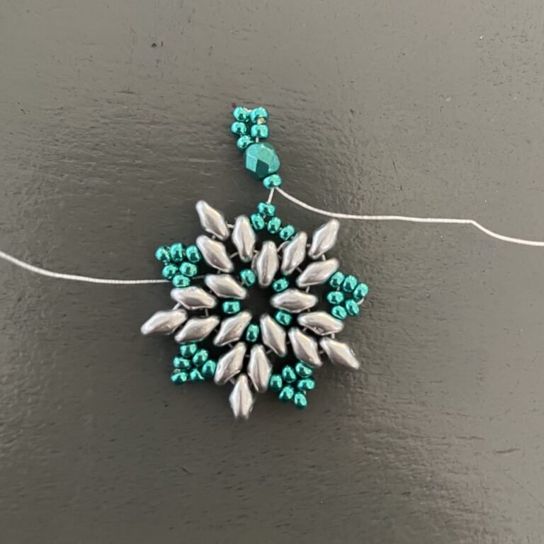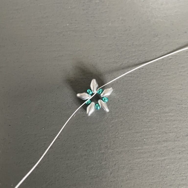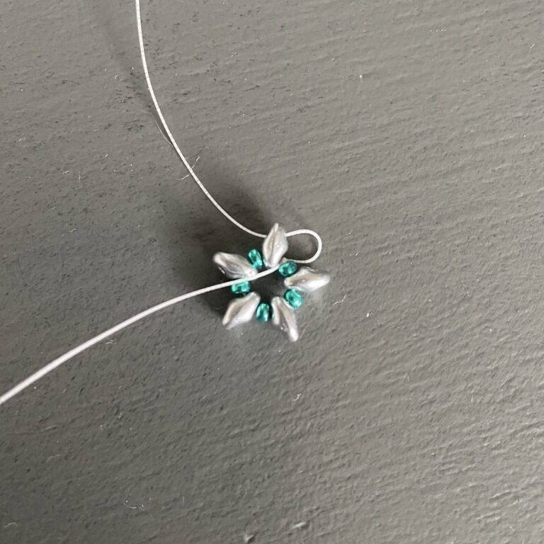 Now complete the circle again until you reach the last 3 seed beads. This time, instead of 3, you’ll string 2 seed beads, followed by a faceted bead and 5 seed beads.