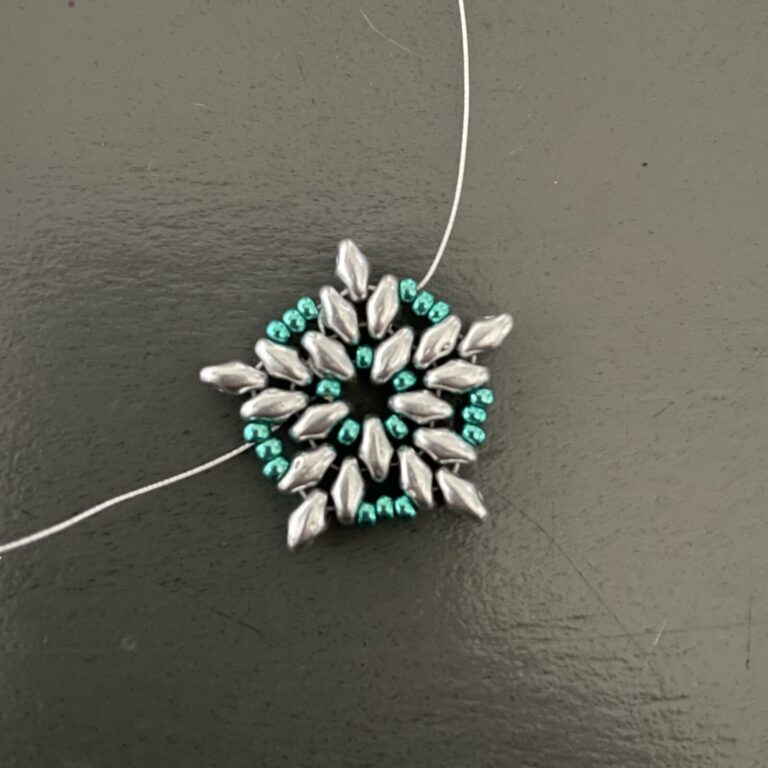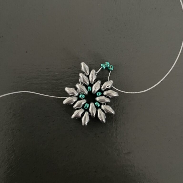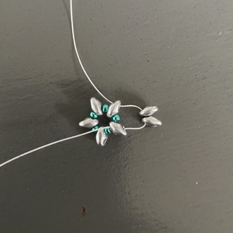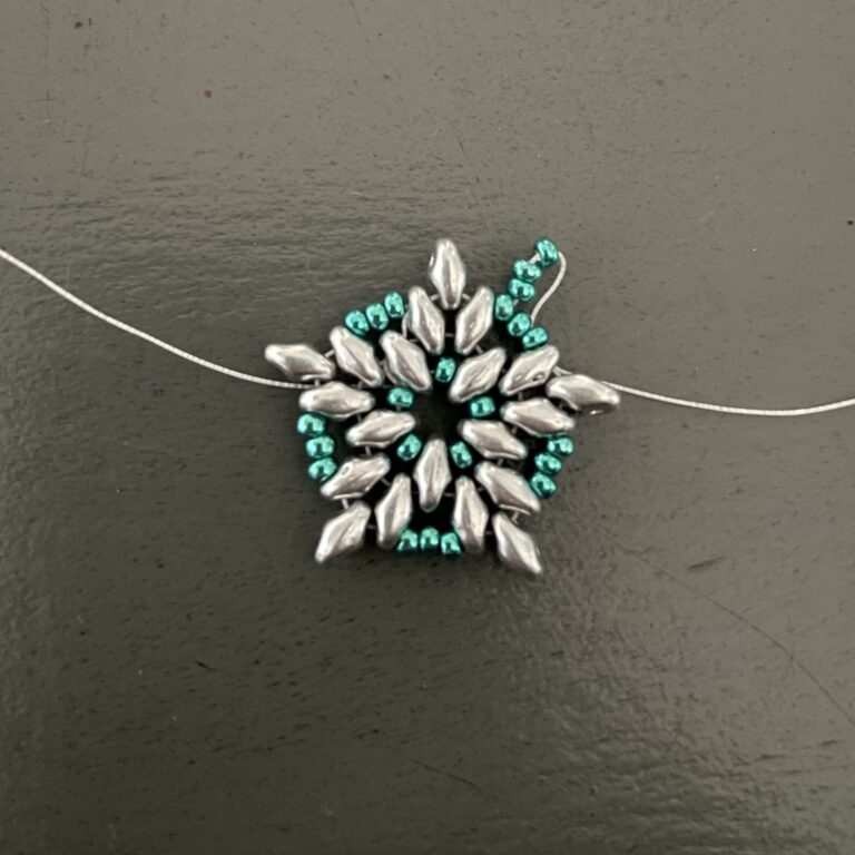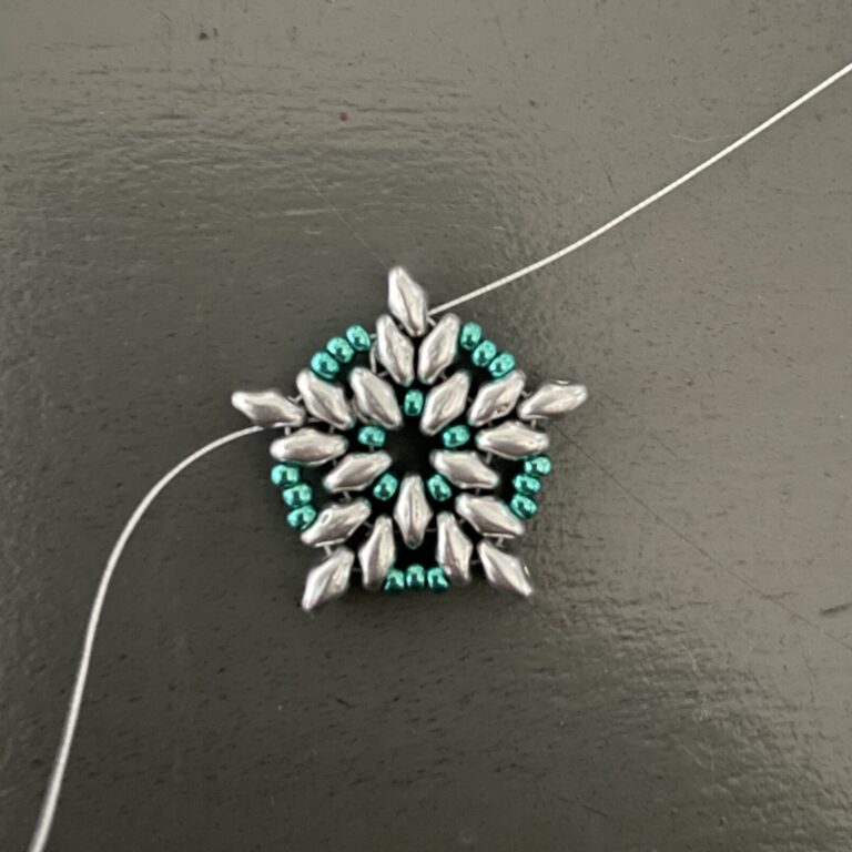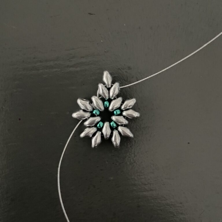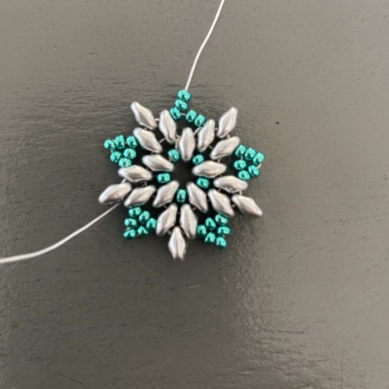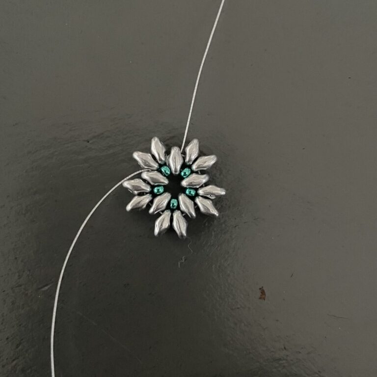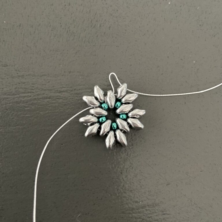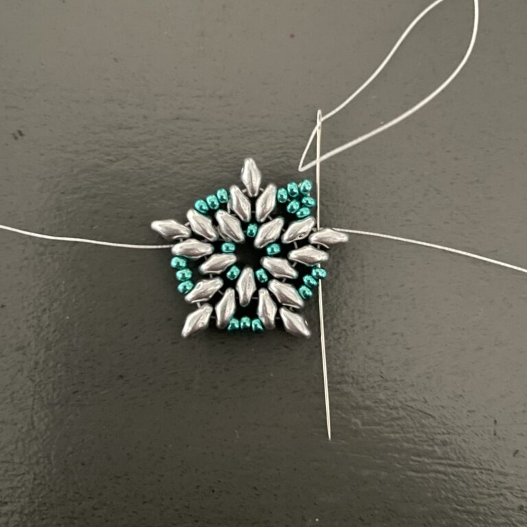 Complete the entire circle in this way by stringing one superduo and three seed beads. Then string it through the bottom of the next superduo and the top of the adjacent superduo, then also string it through the first of the three seed beads. Now string three seed beads and thread the thread back through the third seed bead, forming a neat point.
