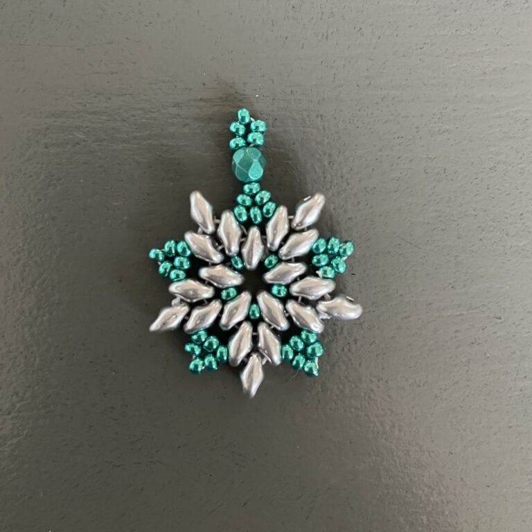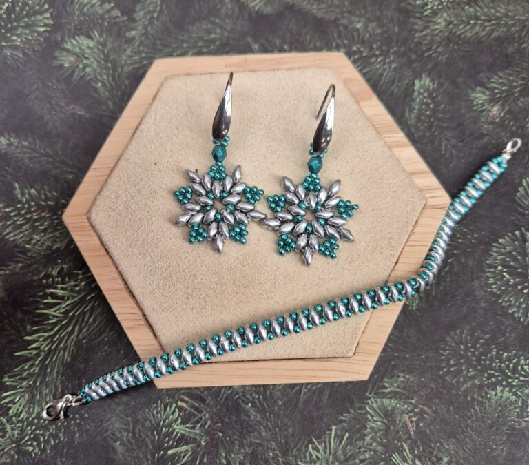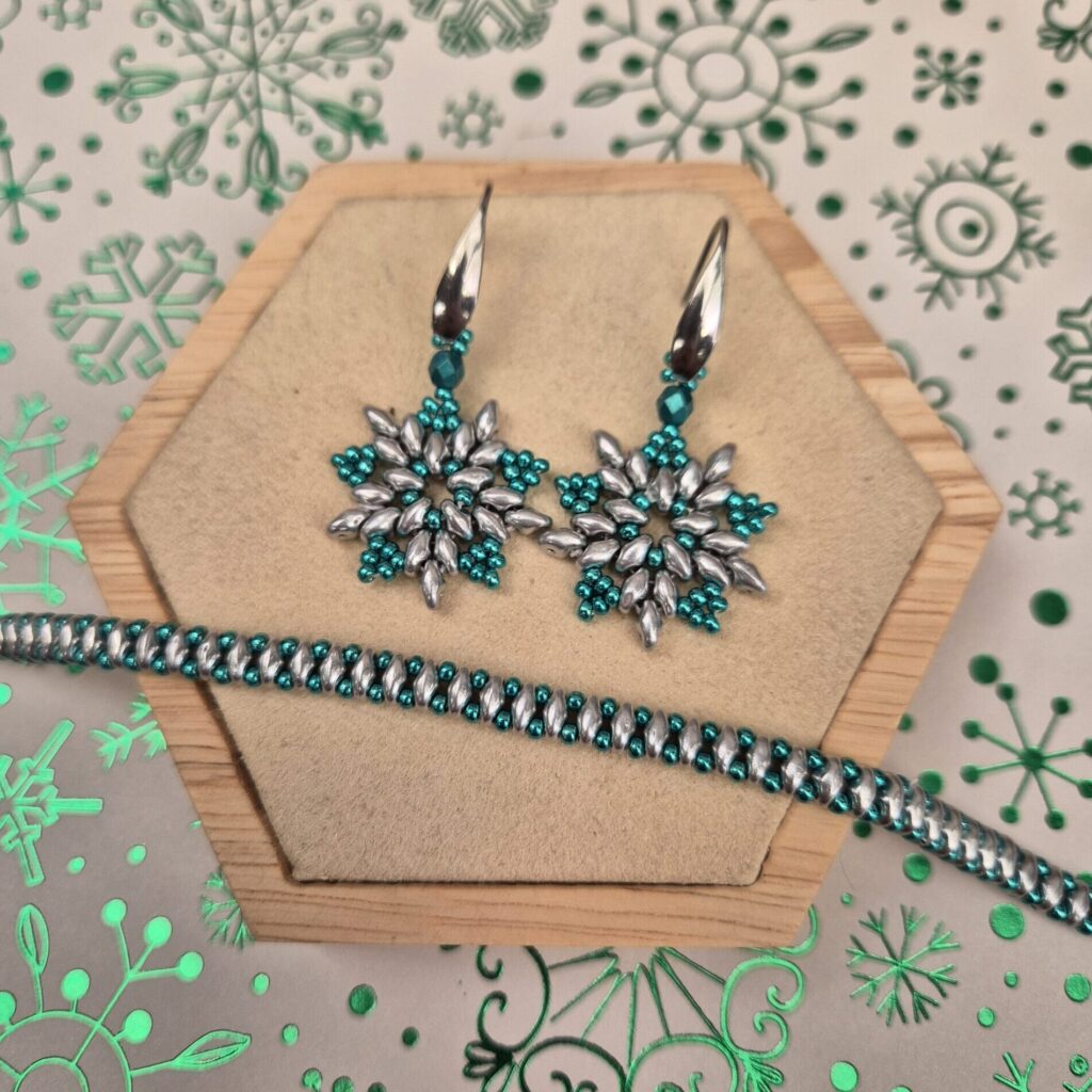But then you’ll have a pair of beautiful earrings. You could go for fun, shiny Christmas/party colors. But if you make this design in other colors, you can easily wear the earrings even after the holidays.