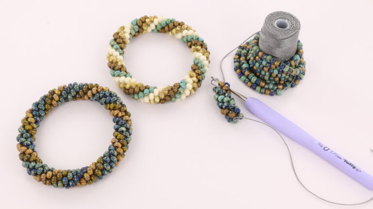 FireLine is more expensive than regular beading thread, but many beaders specifically choose it and won’t use anything else. Your bracelets or necklaces made with FireLine will also be firmer and more compact because the thread is slightly sticky and very strong, so it doesn’t break easily. FireLine is especially useful for 3D objects or projects you want to frame. You do need to be careful with Swarovski or Preciosa bicones, as the inside of these beads can unfortunately cut through the thread.